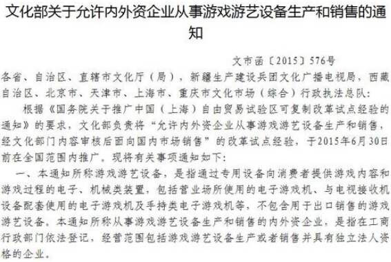 文化部发布了《文化部关于允许内外资企业从事游戏游艺设备生产和销售的通知》。根据《国务院关于推广中国(上海)自由贸易试验区可复制改 革试点经验的通知》的要求,文化部负责将“允许内外资企业从事游戏游艺设备生产和销售,经文化部门内容审核后面向国内市场销售”的改革试点经验,于 2015年6月30日前在全国范围内推广。