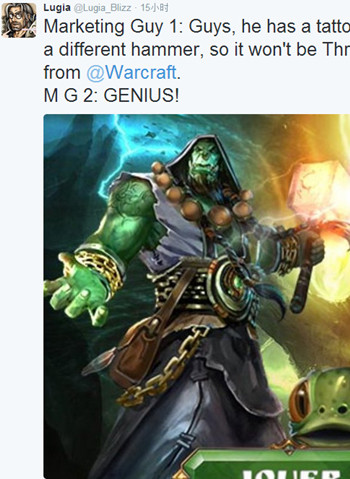 市场部职员1:哥们,这图上的角色手上有刺青,用的锤子也和毁灭之锤不一样,所以不存在和《魔兽世界》里的萨尔撞车的问题。