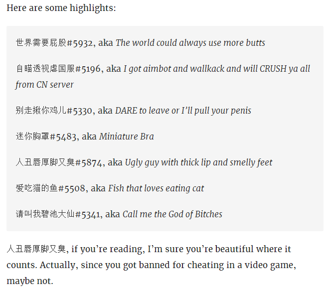 外媒Kotaku近日发了一篇文章《China's Banned Overwatch Players Have Excellent Names》(中国《守望先锋》被封玩家起了超级棒的名字),文章里把部分中文ID翻译成了英文,比如“杀你杀到我厌倦(Killing you makes me tired)”、“这个世界需要更多的屁股(The world needs ass)”。